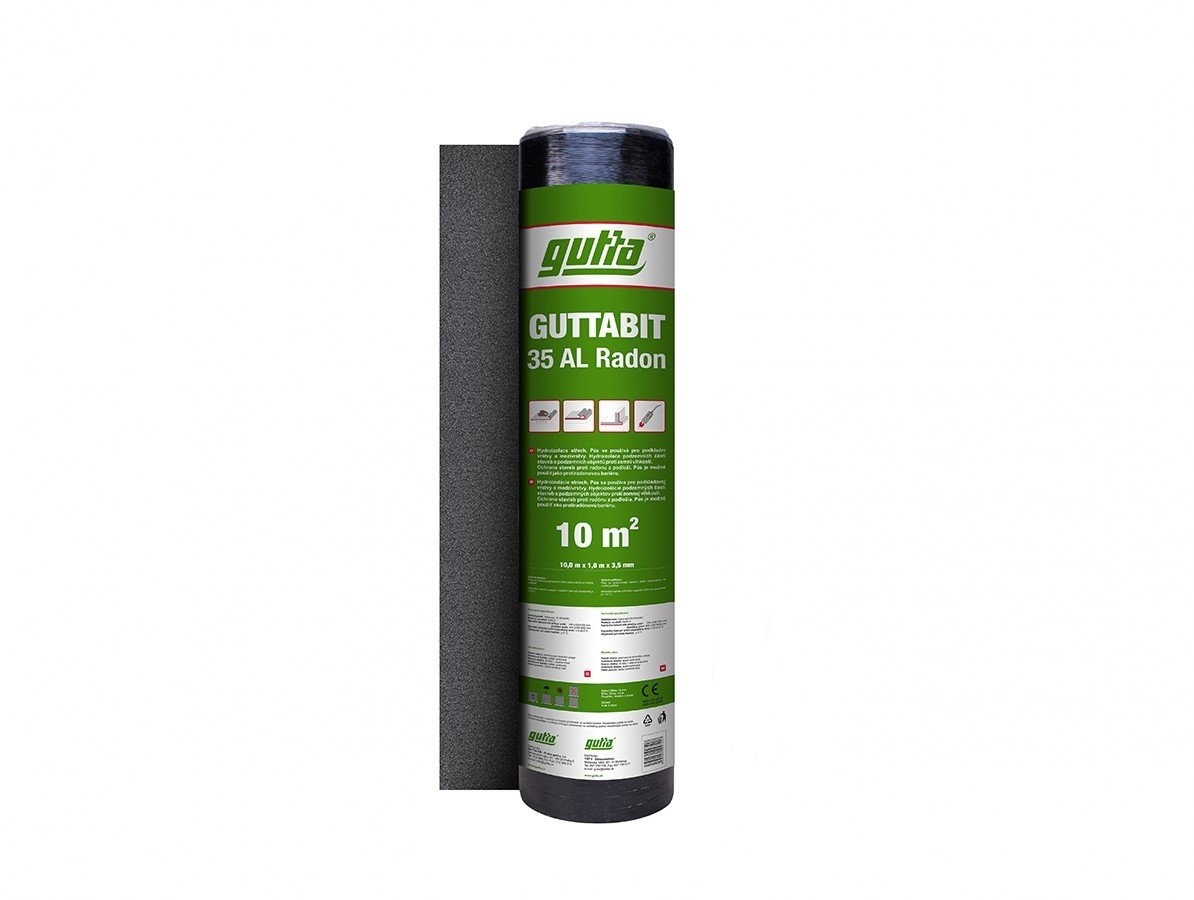 Horní vrstvu asfaltového pásu Guttabit Al Radon 35 tvoří minerální jemnozrnný posyp. Spodní strana je tvořena PE fólií. Asfaltový pás je určený do vícevrstvých skladeb izolací jako izolace spodní stavby proti zemní vlhkosti.