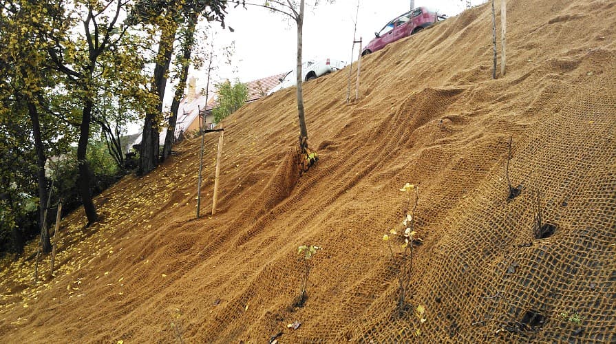Obrázek č. 3: Na strmější svah volte odpovídající protierozní ochranu. V tomto případě realizátoři použili kokosovou rohož.