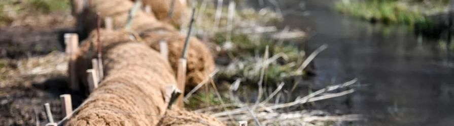 Kokosové válce využití pro zpevnění břehu Ilustrační foto. Kokosové válce (Coir logs) instalované u břehu vodního toku.