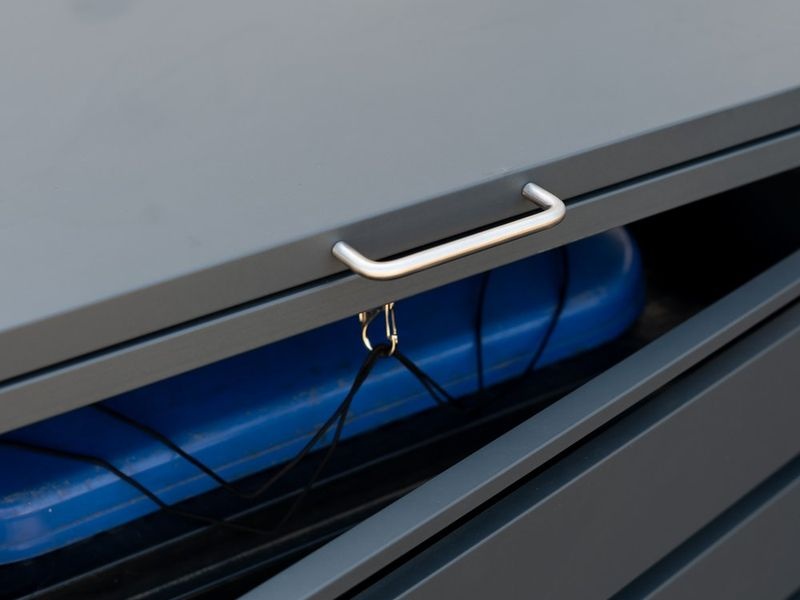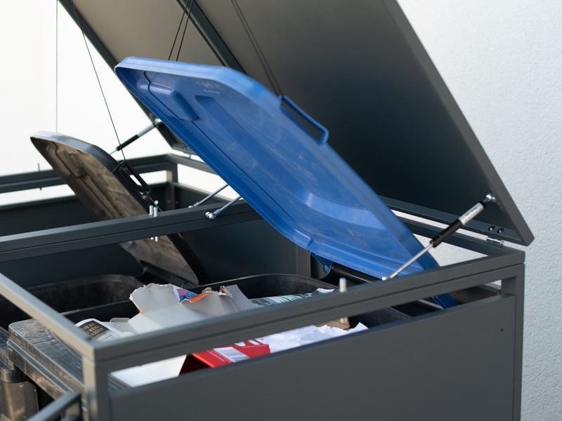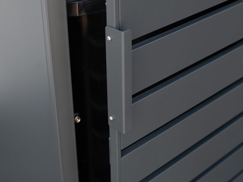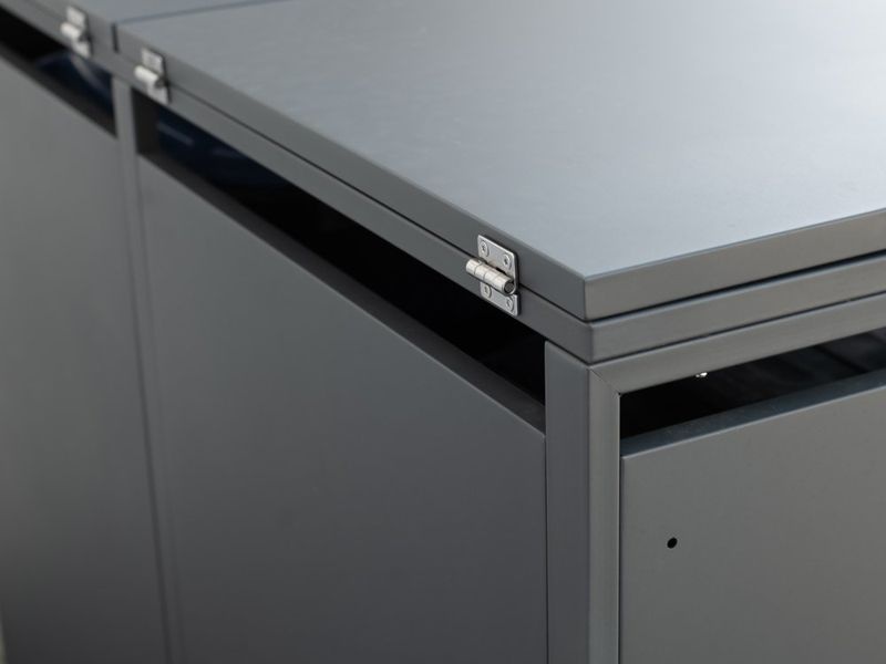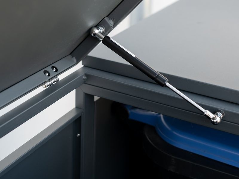 Konstrukce je vyrobena z práškově lakovaného ocelového plechu, který je pevný, odolný proti vlhkosti a nenáročný na údržbu. Praktické plynové písty umožňují pohodlné otevírání víka bez rizika samovolného zavření. Díky dvojici širokých dveří lze popelnice snadno vložit i vysunout.