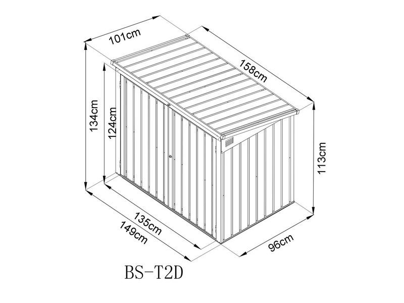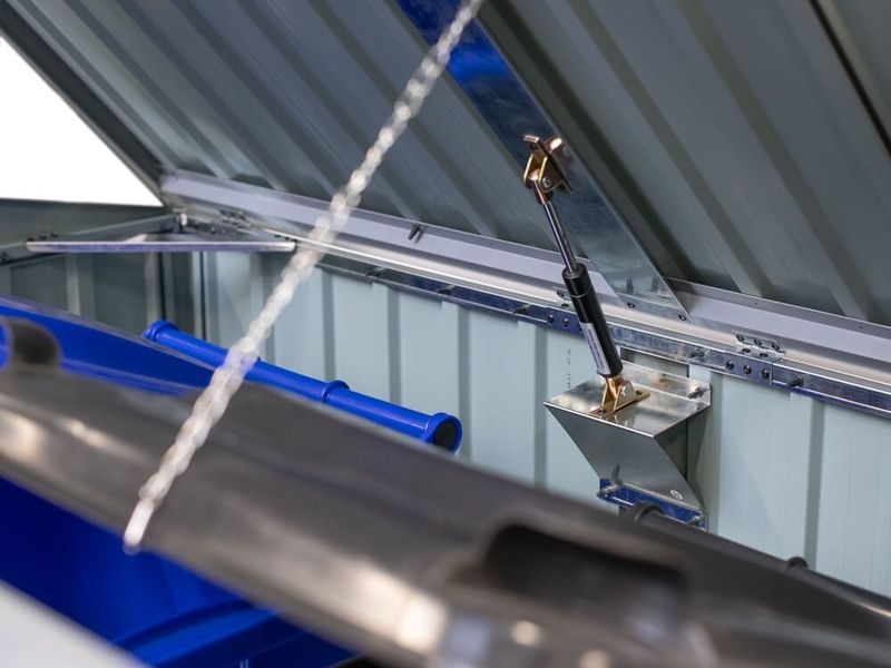 Díky plynovým pístům se víko otevírá snadno a bezpečně. Extra široké dveře (135 × 124 cm) usnadňují manipulaci s popelnicemi. Integrované větrací otvory zabraňují hromadění vlhkosti a nepříjemných pachů, zatímco šikmé pultové víko odvádí dešťovou vodu i sníh směrem dozadu.