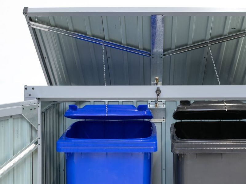 Ocelový box na popelnice je praktické a bezpečné řešení pro dvě 240l nádoby. Robustní konstrukce z pozinkovaného ocelového plechu je vysoce odolná proti korozi, povětrnosti i mechanickému poškození. Profilové výztuhy zajišťují dlouhou životnost a stabilitu celé konstrukce.