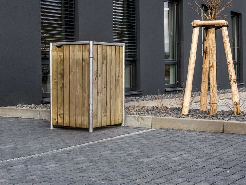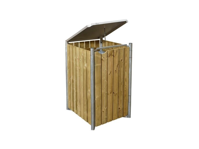 Box na odpadky Hide v přírodním dřevěném provedení spojuje praktickou funkčnost se vzhledem, který zapadne do každé zahrady. Je určený pro jednu nádobu o objemu 140 l a kromě ochrany popelnice může posloužit i jako úložný prostor pro zahradní nářadí.