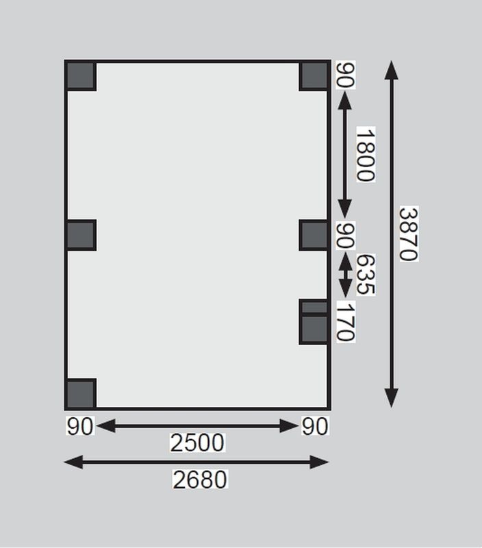 Přístřešek má obdélníkový tvar a svými rozměry vyhovuje většině modelů vozidel na českém trhu. Průjezdná výška je 206 cm.