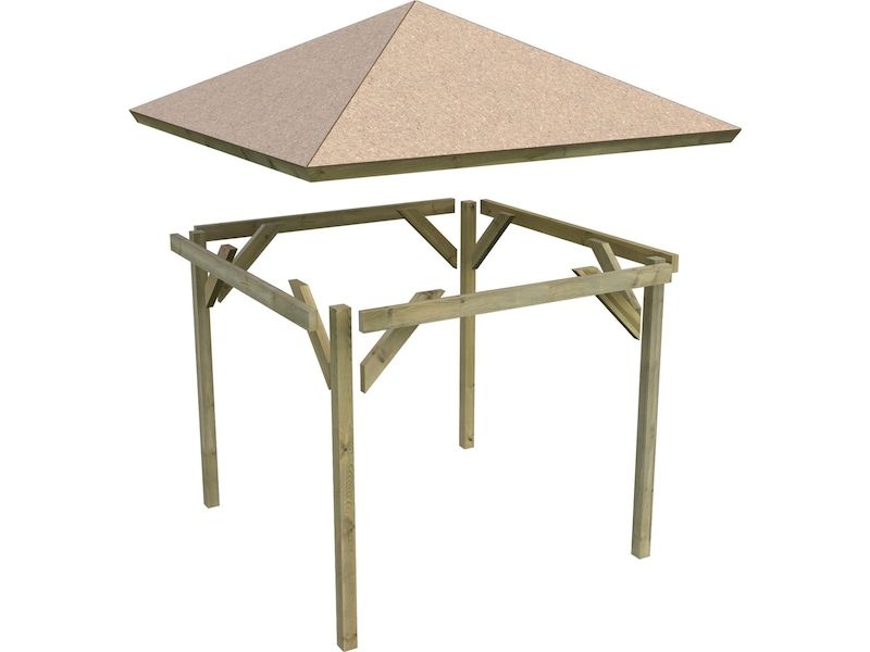 Střecha je zhotovena z dřevěných desek. Střešní krytina není obsahem dodávky a je nutné ji ihned po stavbě doplnit podle vlastní volby. Pro šikmé střechy doporučujeme samolepící bitumenovou lepenku, na ploché střechy samolepící střešní hliníkovo-bitumenovou fólii. U střech se sklonem >15° je vhodný i bitumenový šindel. Únosnost střechy na sníh je 75 kg/m².