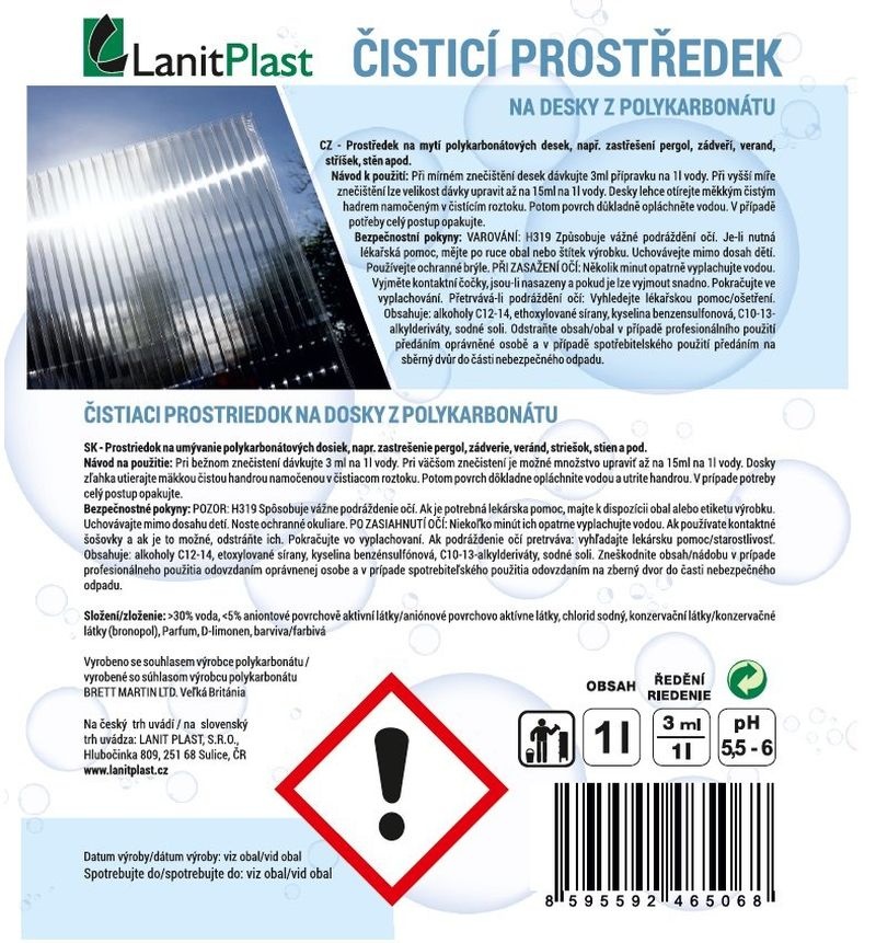Koncentrát o obsahu 1 litr. Vhodný na větší plochy s polykarbonátovými deskami, jako jsou pergoly, stěny, střechy. Z 1 litru koncentrátu vyrobíte až 333 litrů čisticího roztoku.