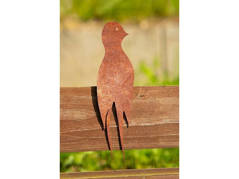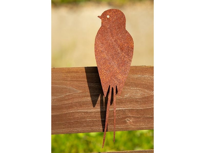 Silueta sedící vlaštovky z cortenu přináší do prostoru klid a přírodní harmonii.