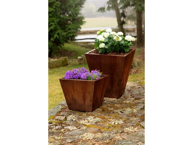 Cortenový květináč pochází z české výroby. Využívá originální švéd­skou ocel COR-TEN®, která v exteriéru přirozeně patinuje – bez nutnosti nátěrů nebo další údržby.