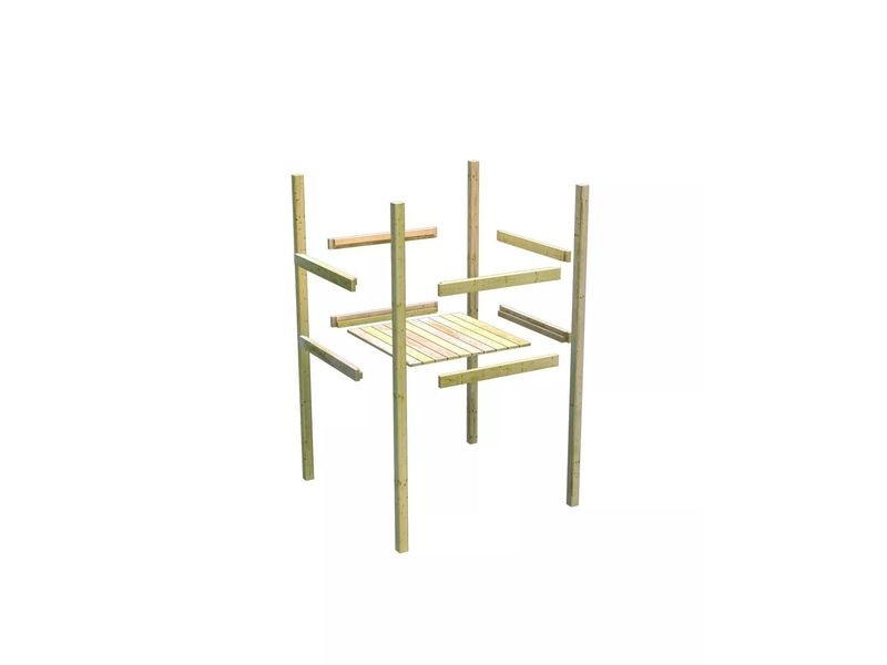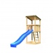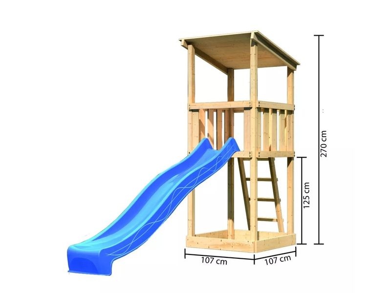 Dětské hřiště o rozměrech 107 × 107 × 270 cm je vyrobeno z toho nejlepšího smrkového dřeva. Naše dřevo pochází ze vzdáleného severu Evropy a je chemicky naprosto neošetřené. V důsledku toho neobsahuje žádné známé problematické látky. Hřiště má nosné sloupy o tloušťce 68 × 68 mm a je vyrobené z dřevěných profilů o síle 18 mm (spoje v systému pero/drážka). Terasa s domkem se nachází ve výšce 125 cm, tím hřiště nabízí dětem dokonalý výhled na zahradu. Sedlová střecha je vyrobena z dřevotřískových desek. Hřiště je standardně vybaveno robustním dřevěným žebříkem se 4 příčkami a pískovištěm pod věží.