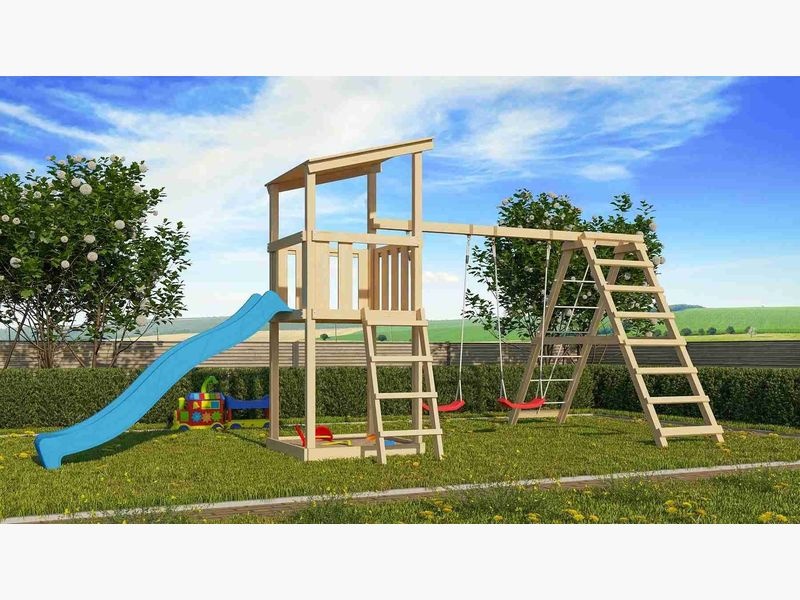 Dětské hřiště Karibu Anna přináší vašim dětem bezpečnou a zábavnou herní plochu s dlouhou životností. Skluzavka, žebříková prolézačka, dvě houpačky a prostor pro pískoviště poskytnou dětem spoustu možností ke hrám a zaručí zábavu na dlouhé hodiny.