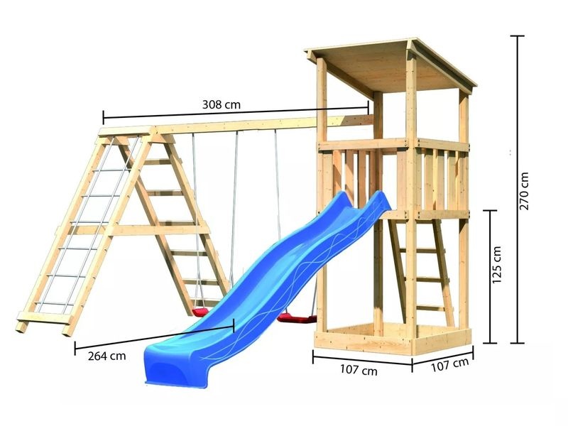 Dětské hřiště s půdorysem 415 × 264 cm a věží o rozměrech 107 × 107 × 270 cm je vyrobeno z toho nejlepšího smrkového dřeva. Naše dřevo pochází ze vzdáleného severu Evropy a je chemicky naprosto neošetřené. V důsledku toho neobsahuje žádné známé problematické látky. Hřiště má nosné sloupy o tloušťce 68 × 68 mm a je vyrobené z dřevěných profilů o síle 18 mm (spoje v systému pero/drážka). Terasa s domkem se nachází ve výšce 125 cm, tím hřiště nabízí dětem dokonalý výhled na zahradu. Sedlová střecha je vyrobena z dřevotřískových desek. Hřiště je standardně vybaveno robustním dřevěným žebříkem se 4 příčkami a pískovištěm pod věží.