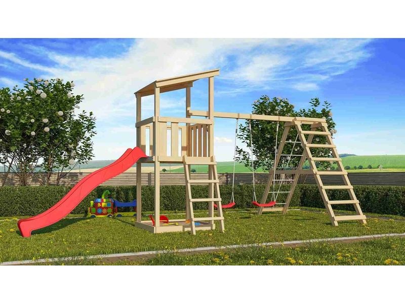 Dětské hřiště s půdorysem 415 × 264 cm a věží o rozměrech 107 × 107 × 270 cm je vyrobeno z toho nejlepšího smrkového dřeva. Naše dřevo pochází ze vzdáleného severu Evropy a je chemicky naprosto neošetřené. V důsledku toho neobsahuje žádné známé problematické látky. Hřiště má nosné sloupy o tloušťce 68 × 68 mm a je vyrobené z dřevěných profilů o síle 18 mm (spoje v systému pero/drážka). Terasa s domkem se nachází ve výšce 125 cm, tím hřiště nabízí dětem dokonalý výhled na zahradu. Sedlová střecha je vyrobena z dřevotřískových desek. Hřiště je standardně vybaveno robustním dřevěným žebříkem se 4 příčkami a pískovištěm pod věží.