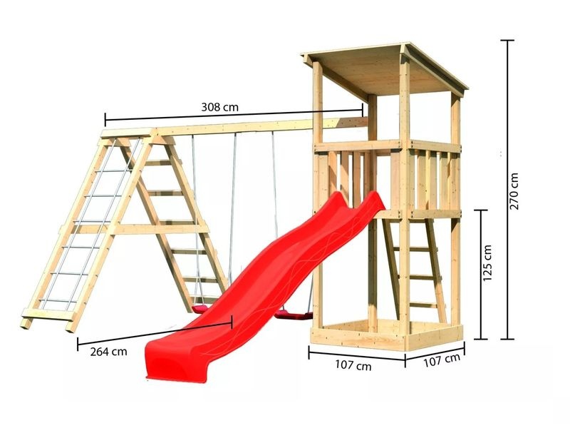 Dětské hřiště s půdorysem 415 × 264 cm a věží o rozměrech 107 × 1­07 × 270 cm je vyrobeno z toho nejlepšího smrko­vého dřeva. Naše dřevo pochází ze vzdáleného severu Evropy a je chemicky naprosto neošetřené. V důsledku toho neobsahuje žádné známé problematické látky. Hřiště má nosné sloupy o tloušťce 68 × 68 mm a je vyrobené z dřevěných profilů o síle 18 mm (spoje v systému pero/drážka). Terasa s domkem se nachází ve výšce 125 cm, tím hřiště nabízí dětem dokonalý výhled na zahradu. Sedlová střecha je vyrobena z dřevotřískových desek. Hřiště je standardně vybaveno robustním dřevěným žebříkem se 4 příčkami a pískovištěm pod věží.
