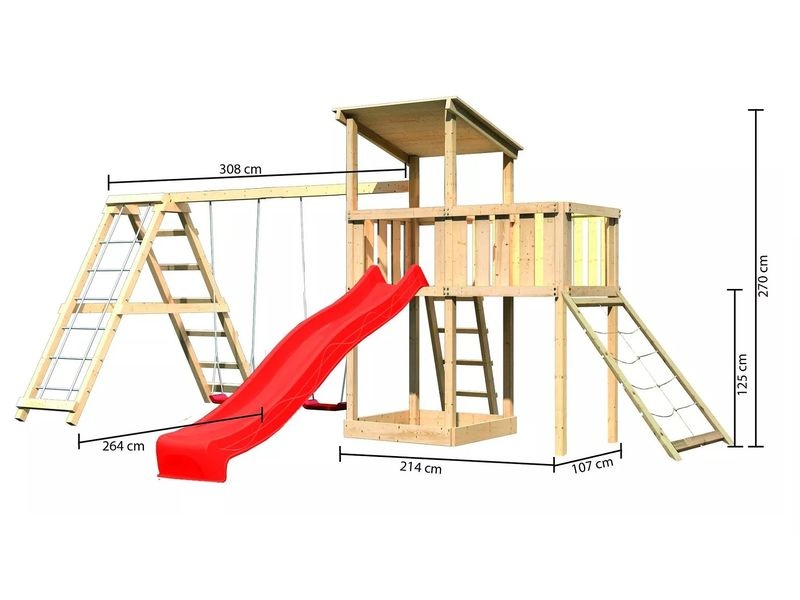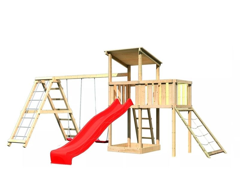 Dětské hřiště Karibu Anna přináší vašim dětem bezpečnou a zábavnou herní plochu s dlouhou životností. Skluzavka, síťová rampa, žebřík, dvě houpačky a prostor pro pískoviště poskytnou dětem spoustu možností ke hrám a zaručí zábavu na dlouhé hodiny.