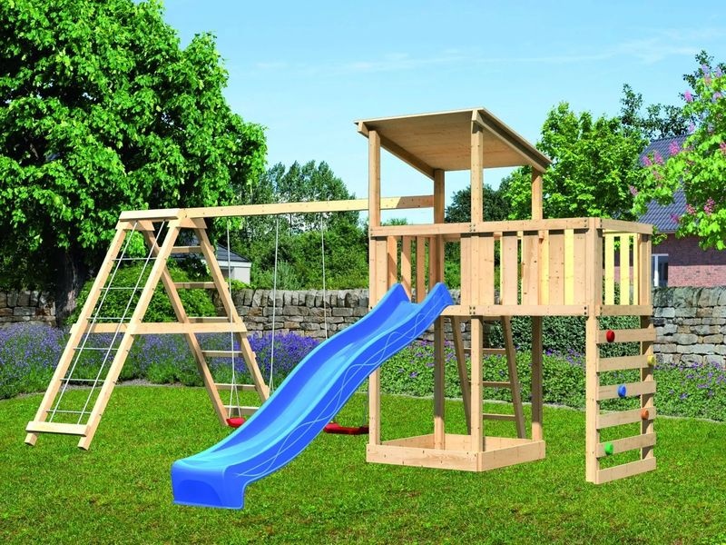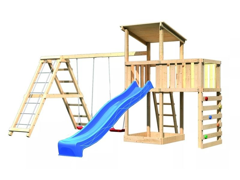 Dětské hřiště Karibu Anna přináší vašim dětem bezpečnou a zábavnou herní plochu s dlouhou životností. Skluzavka, horolezecká stěna, žebřík, dvě houpačky a prostor pro pískoviště poskytnou dětem spoustu možností ke hrám a zaručí zábavu na dlouhé hodiny.