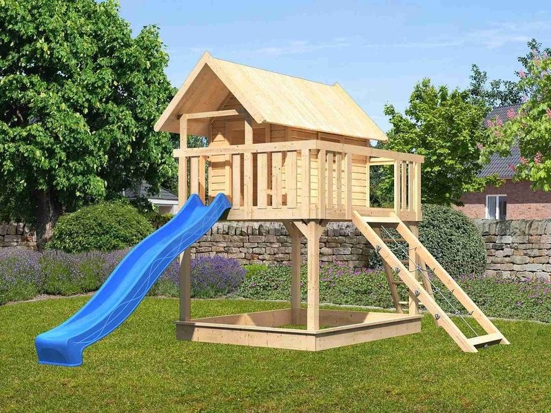 Dětské hřiště Karibu Fidel přináší vašim dětem bezpečnou a zábavnou herní plochu s dlouhou životností. Skluzavka, síťová rampa a prostor pro pískoviště poskytnou dětem spoustu možností ke hrám a zaručí zábavu na dlouhé hodiny.