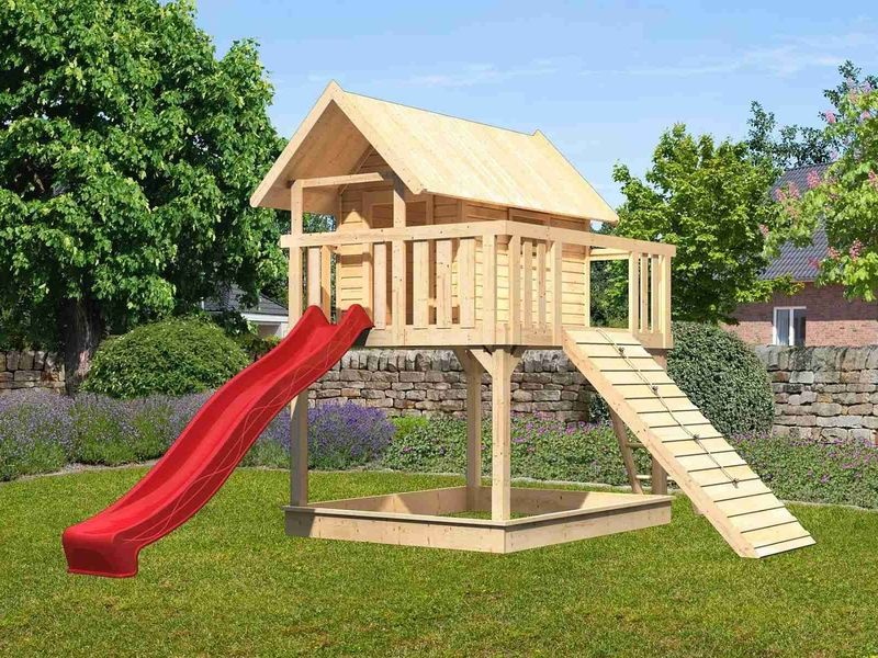 Dětské hřiště Karibu Fidel přináší vašim dětem bezpečnou a zábavnou herní plochu s dlouhou životností. Skluzavka, dřevěná rampa a prostor pro pískoviště poskytnou dětem spoustu možností ke hrám a zaručí zábavu na dlouhé hodiny.
