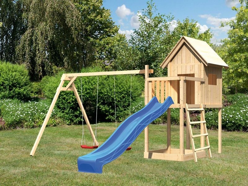 Dětské hřiště Karibu Frieda přináší vašim dětem bezpečnou a zábavnou herní plochu s dlouhou životností. Věž, dřevěná rampa, skluzavka, houpačka a prostor pro pískoviště poskytnou dětem spoustu možností ke hrám a zaručí zábavu na dlouhé hodiny.