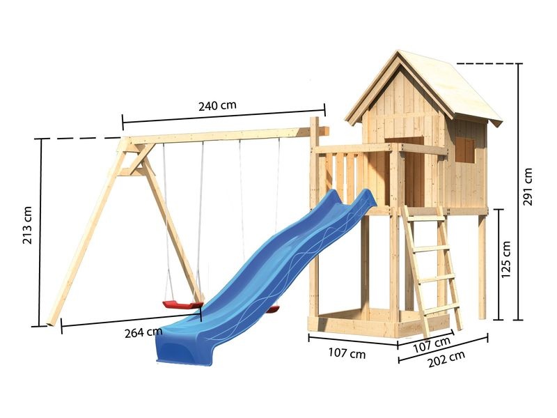 Dětské hřiště s rozměry š 107 x d 107 x v 291 cm je vyrobeno z toho nejlepšího smrkového dřeva. Naše dřevo pochází ze vzdáleného severu Evropy a je chemicky naprosto neošetřené. V důsledku toho neobsahuje žádné známé problematické látky. Hřiště má nosné sloupy o tloušťce 68 × 68 mm a je vyrobené z dřevěných profilů o síle 18 mm (spoje v systému pero/drážka). Díky výšce plošiny 125 cm nabízí hřiště dětem dokonalý výhled na zahradu, ale zároveň bezpečí. Sedlová střecha je vyrobena z dřevotřískových desek. Hřiště je standardně vybaveno robustním dřevěným žebříkem se 4 příčkami a pískovištěm pod věží. Dětské hřiště Karibu Frieda má certifikát TÜV Nord ověřující bezpečnost výrobku (GS) podle DIN EN 71–1, DIN EN 71–3, DIN EN 71–8 a AfPS GS 2014.