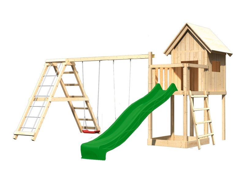 Dětské hřiště Karibu Frieda přináší vašim dětem bezpečnou a zábavnou herní plochu s dlouhou životností. Skluzavka, žebřík, dvě houpačky a prostor pro pískoviště poskytnou dětem spoustu možností ke hrám a zaručí zábavu na dlouhé hodiny.