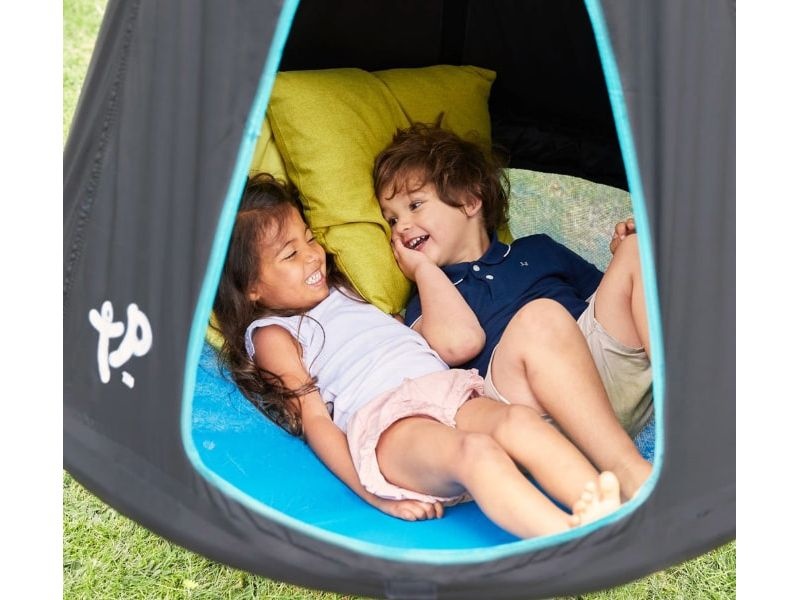 Závěsná houpačka je bezpečně spojena s prolézačkou a je vyrobena z prodyšného polyesteru odolného proti povětrnostním vlivům. Vstupní dveře lze uzavřít, což nabízí ještě větší pocit tajuplnosti.