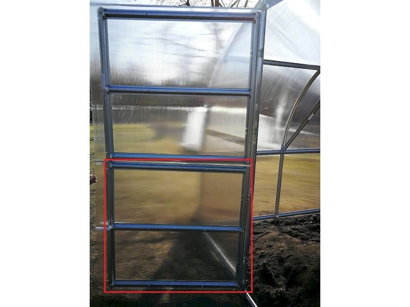 Dveře se zabudují na zadní čelo skleníku pod ventilační okno. Pevně zabudovaný polykarbonát pod oknem namontujete na pohyblivé křídlo dveří a z ventilačního okna tím vytvoříte dvoukřídlé dveře.