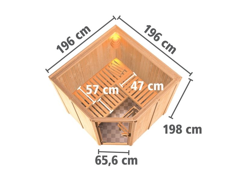 Domácí finská sauna Karibu Jarin o rozměch 196 × 196 cm je vhodná do temperovaných interiérů domu nebo do bytu. Výrobce, firma Karibu Holztechnik z německých Brém, dokázala svými výrobky úspěšně navázat na staletou tradici skandinávského saunování a současně do ní zapracovat dnešní moderní technologie. Saunu mohou současné využívat tři osoby.
