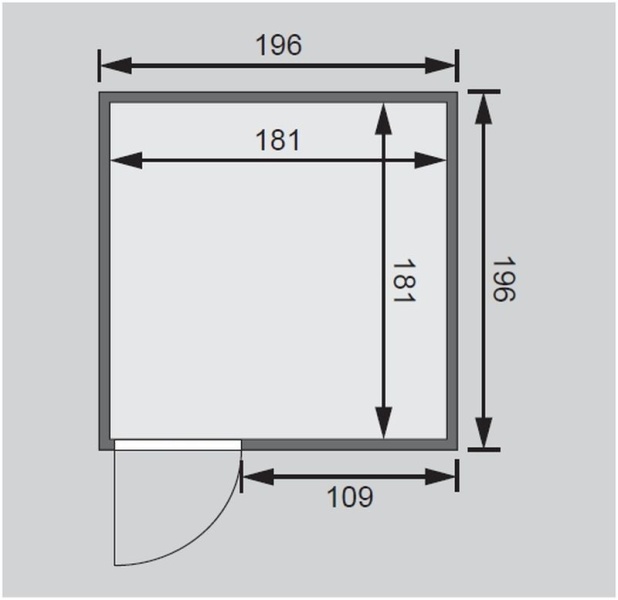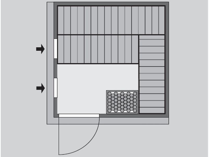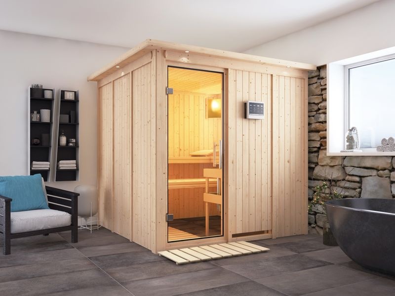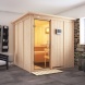 Finská sauna Karibu Rodin o rozměrech 196 × 196 cm. Saunu mohou najednou využít až tři osoby. Tento model finské sauny je vhodný do temperovaných interiérů domu nebo do bytu.