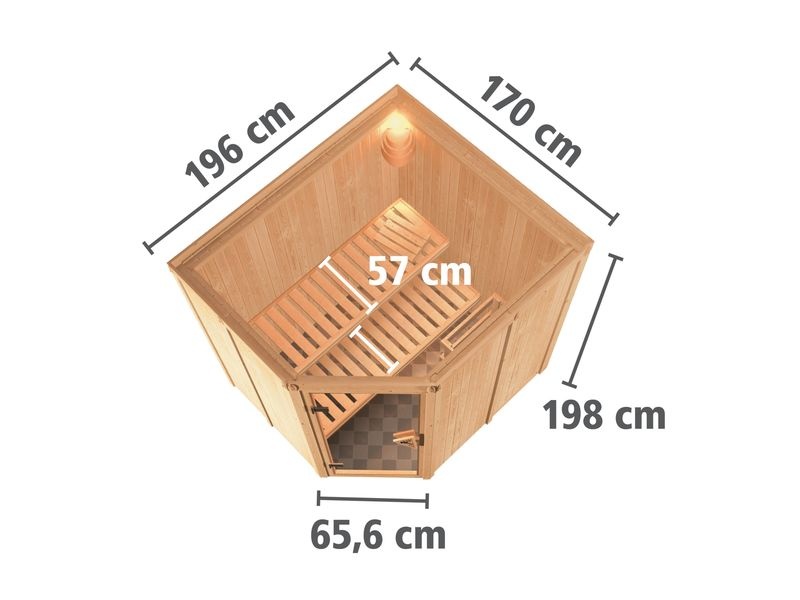 Domácí sauna Karibu Siirin do menších bytů. Tento model finské sauny o rozměch 196 × 705 cm je vhodný do temperovaných interiérů domu nebo do bytu. Saunu mohou současné využívat dvě osoby.