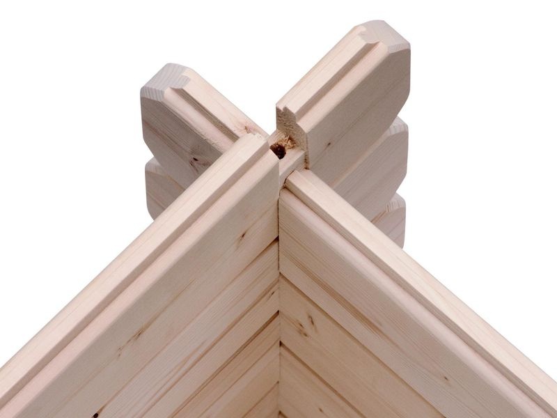 Střecha je zhotovena z dřevotřískových desek. Střešní krytina není obsahem dodávky a je potřeba ji ihned po stavbě doplnit podle vlastní volby. Pro domky se šikmou střechou doporučujeme samolepící bitumenovou lepenku, na ploché střechy samolepící střešní hliníkovo-bitumenovou fólii.