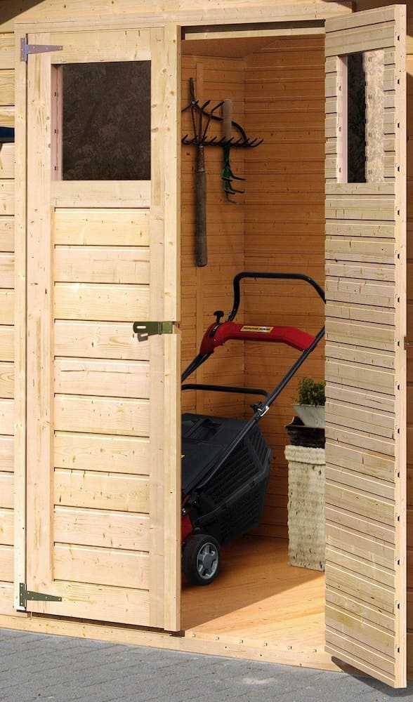 Světlý zahradní domek Karibu Amberg natur z prémiového dřeva. Modely mají sedlovou střechu a dvoukřídlé dveře na pantech s oknem v každém křídle. Stavebním materiálem domku jsou dřevěné profily o síle 19 mm.