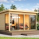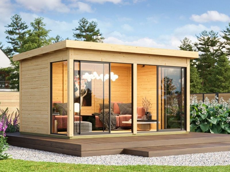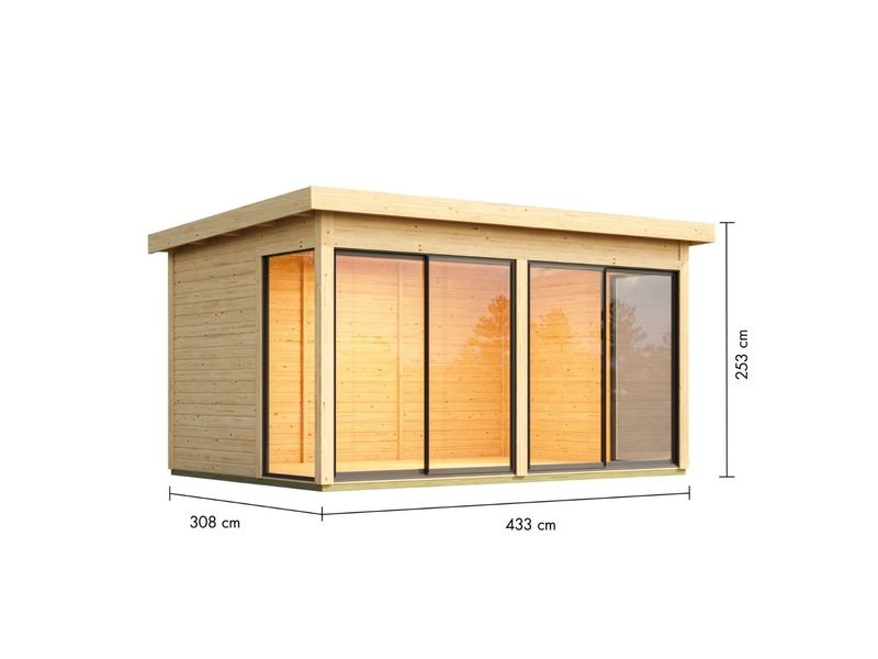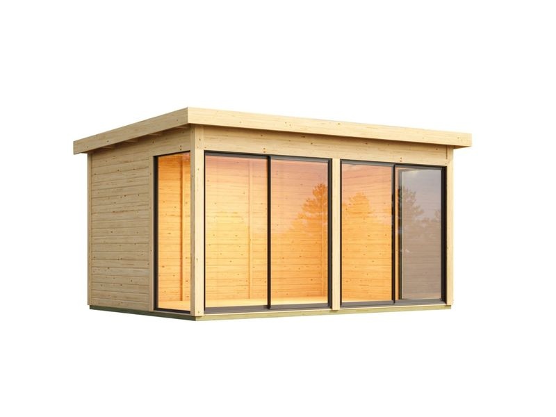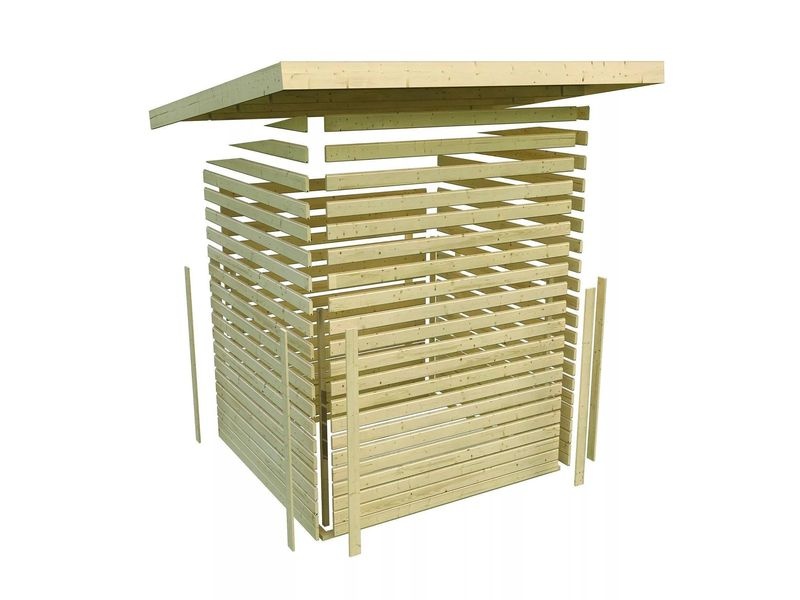 KARIBU DICE 5 je prostorný moderní zahradní domek s plochou střechou, který nabízí dostatek místa pro zahradní techniku, hobby dílnu nebo relaxační prostor na zahradě. Konstrukce z masivních dřevěných profilů o síle 38 mm ze severského smrku se systémem dvojitého spoje pero–drážka zajišťuje vysokou stabilitu, dlouhou životnost a odolnost vůči povětrnostním vlivům.