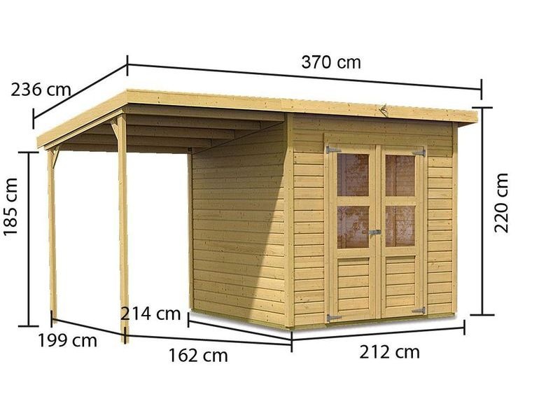 Dřevěný zahradní domek s přístavkem o délce 1,6 m. Dřevěné profily jsou zhotoveny z prémiového severského smrku. Záruka 5 let na konstrukci. Síla stěny: 14 mm. Ideální pro uskladnění zahradního nářadí nebo zahradní relaxaci. Zastavěná plocha: 3,98 – 9,96 m2 (podle modelu domku).