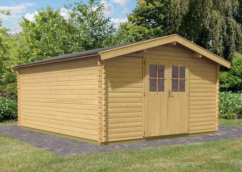 Dřevěný domek se silnou masivní stěnou. Tyto modely mají sedlovou střechu a dvoukřídlé dveře na pantech s oknem v každém křídle. Stavebním materiálem domku jsou profily o síle 40 mm, perfektně vyfrézované ze severského smrku.