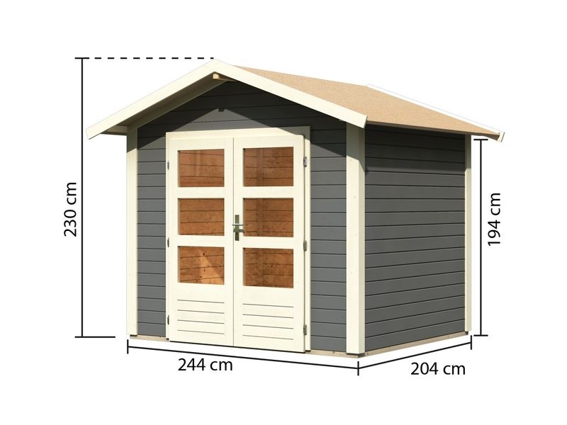 Dřevěný zahradní domek má pultovou střechu a dvoukřídlé dveře na pantech s oknem v každém křídle. Stavebním materiálem domku jsou dřevěné profily o síle 28 mm, které jsou perfektně vyfrézované ze severského smrku. Tyto modely domků jsou dostupné v přírodním provedení (natur) nebo s tmavě šedým nátěrem.