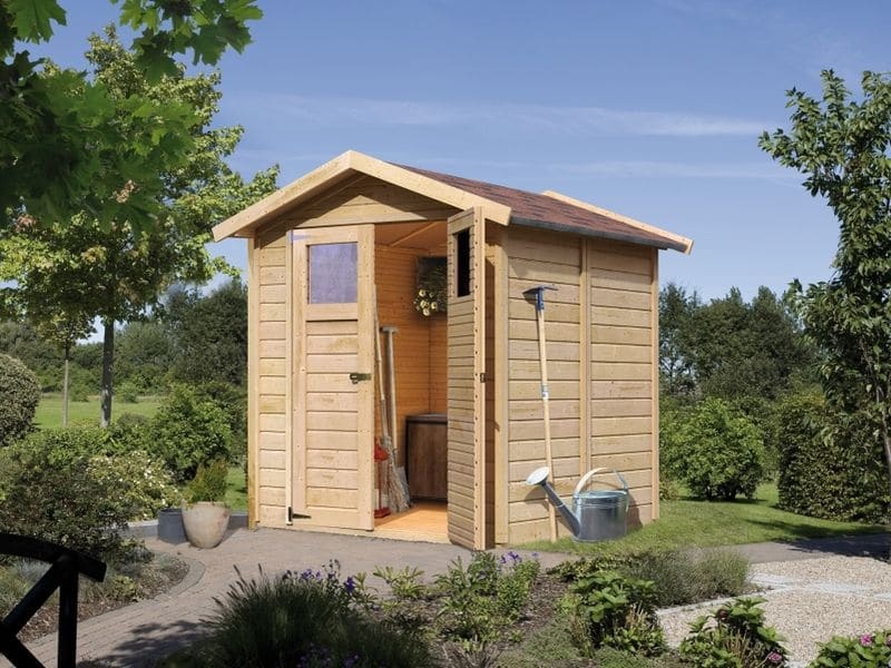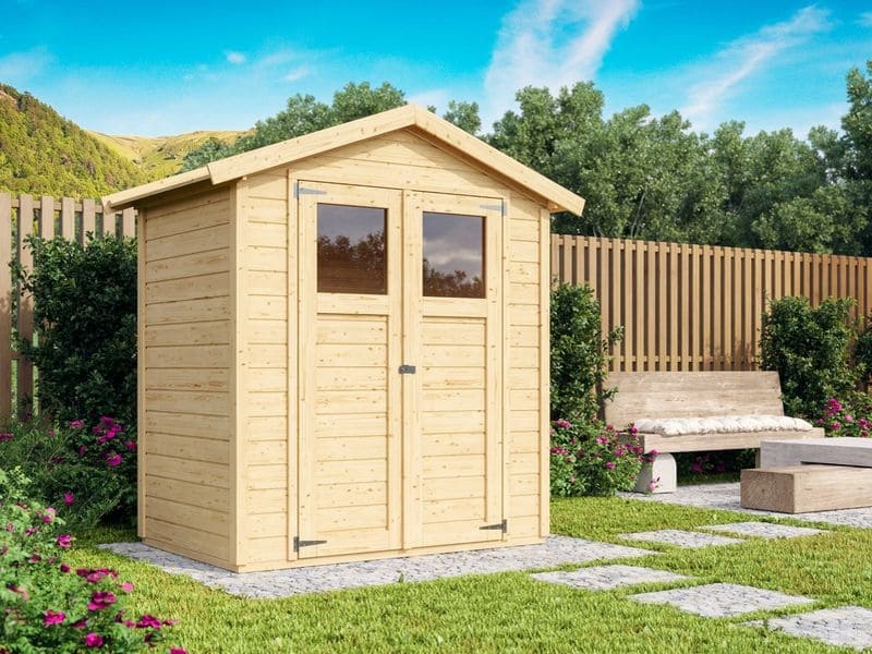 Základní model dřevěného domku pro vaši zahradu. Model má sedlovou střechu a dvoukřídlé dveře na pantech (rozměry 114,5 × 175 cm) s oknem v každém křídle (rozměr 50,5 × 50,5 cm). Stavebním materiálem jsou profily o síle 14 mm, perfektně vyfrézované ze severského smrku.
