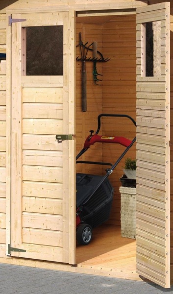 Základní model dřevěného domku pro vaši zahradu. Model má sedlovou střechu a dvoukřídlé dveře na pantech s oknem v každém křídle (rozměry dveří: š. 115 × v. 174 cm). Stavebním materiálem domku jsou profily o síle 14 mm, perfektně vyfrézované ze severského smrku.