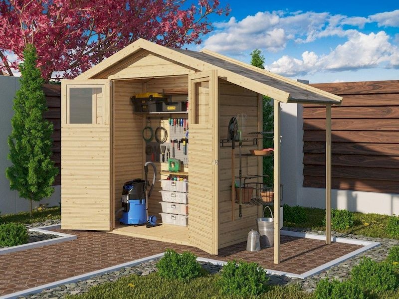 Základní model dřevěného domku pro vaši zahradu. Tento model má sedlovou střechu a dvoukřídlé dveře na pantech s oknem v každém křídle. Stavebním materiálem domku jsou dřevěné profily o síle 14 mm perfektně vyfrézované ze severského smrku.