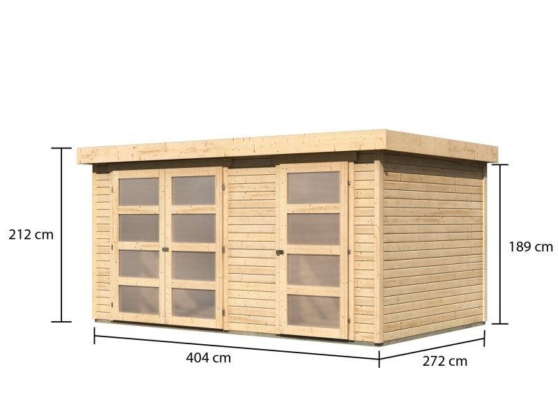 Základní model dřevěného domku pro vaši zahradu. Domek má pultovou střechu a 1× dvoukřídlé + 1× jednokřídlé dveře na pantech s oknem v každém křídle. Stavebním materiálem domku jsou profily o síle 19 mm perfektně vyfrézované ze severského smrku.