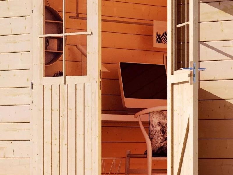 KARIBU NORDLAND je prostorný dřevěný zahradní domek německé výroby s robustní konstrukcí ze 38 mm silných profilů severského smrku. Díky přesnému frézování a systému pero–drážka nabízí vysokou stabilitu a dlouhou životnost.