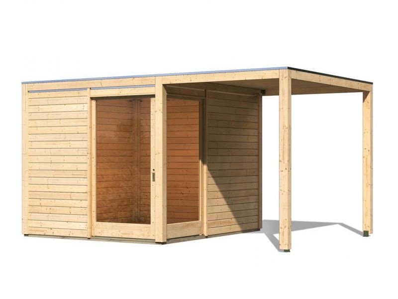 Tato verze zahradního domku obsahuje otevřený přístavek o délce 200 cm pro venkovní posezení.