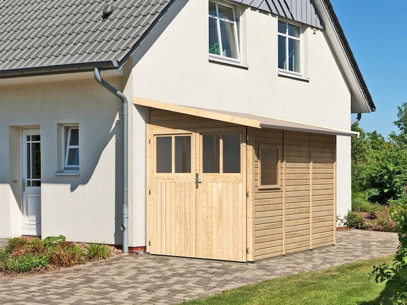 Dřevěný domek ke zdi. V domku můžete uskladnit zahradní techniku, nářadí nebo si v něm vybudovat kutilskou dílnu. Domek má šikmou střechu a jedny dvoukřídlé dveře na pantech s oknem v každém křídle. Dveře lze dát i z druhé kratší strany. Jedině, kam nepasují, je na delší stranu domku.