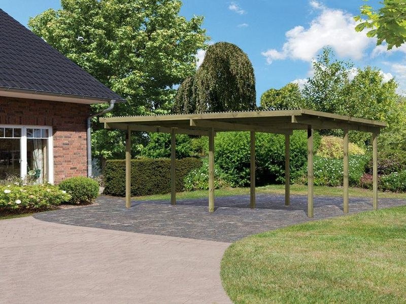 Dvojitý dřevěný přístřešek pro auto (tzv. carport). Přístřešek byl vyroben v Německu. Tento model garážového stání výborně poslouží jako ochranný přístřešek pro váš automobil. Můžete ho využít jako dočasný úkryt zahradního traktůrku, lodi nebo pod něj postavit sušák s prádlem, pokud váš venku překvapí déšť.