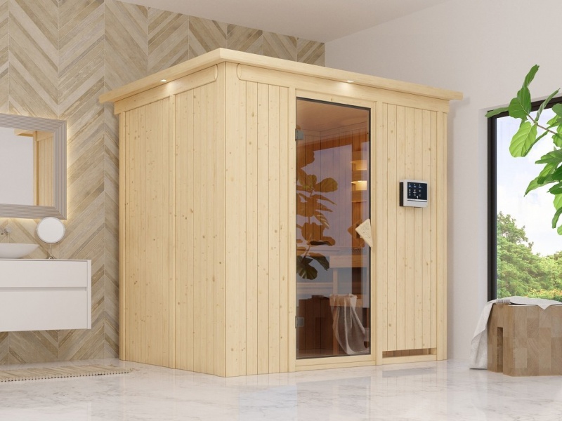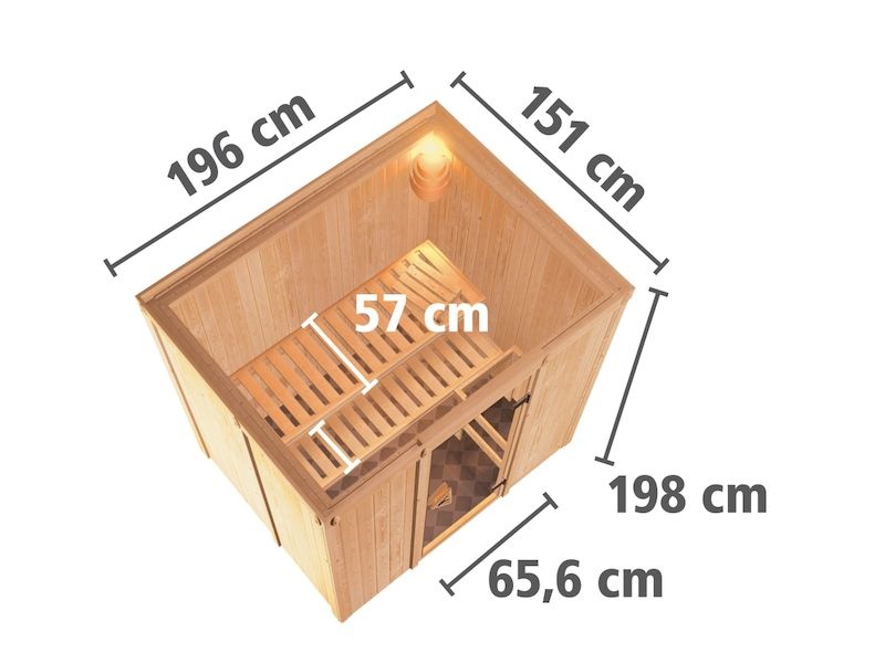 Malá finská sauna Karibu Bodin pro dvě osoby. Má čtvercové rozměry 196 × 151 cm. Tento model finské sauny je určený do temperovaných interiérů domu nebo bytu.