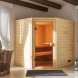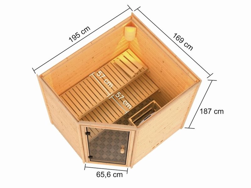 Domácí finská sauna Karibu Elea má rozměry 195 × 169 cm a je vybavena rohovými dveřmi. Tento model finské sauny je určený do temperovaných interiérů domu nebo bytu.