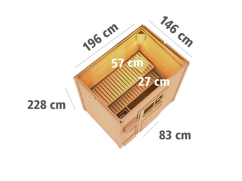 Kamna nejsou obsahem dodávky venkovní sauny. Vzhledem k tomu, že se jedná o zahradní sauny, doporučujeme dokoupit 9 kW kamna. Vyžadují 400 V, jištění 16 A, kabel 5 × 2,5 mm a odborné zapojení.