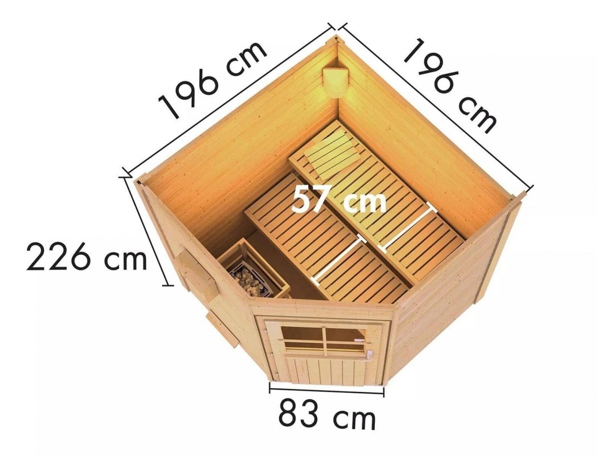 Sauna je složena ze speciálně hlazených prken s dvojitým perem a drážkou, což umožňuje mimořádnou pevnost spoje. K tomu aby teplo ze sauny neunikalo, je nainstalován druhý strop s minerální izolační vatou o tloušťce 42 mm.