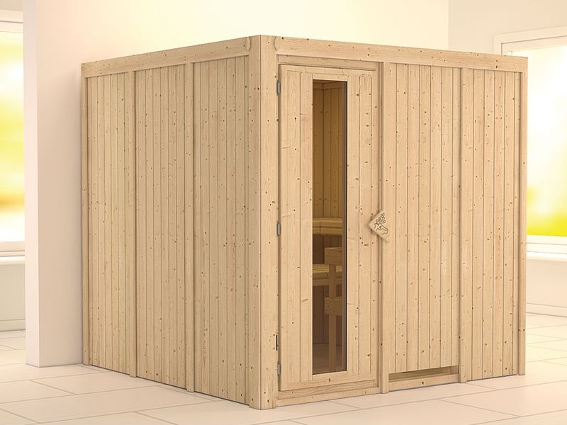 Finská sauna Karibu Rodin o rozměrech 196 × 196 cm. Saunu mohou najednou využít až tři osoby. Tento model finské sauny je vhodný do temperovaných interiérů domu nebo do bytu.