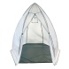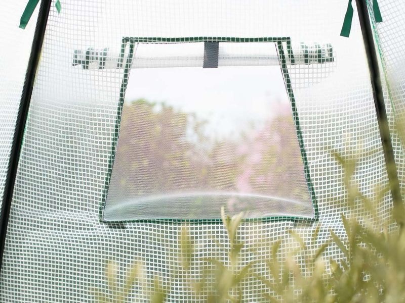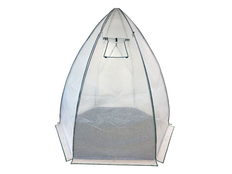 Stabilní ocelová konstrukce je potažena odolnou UV-stabilní fólií, která v létě chrání před přímým sluncem a v zimě izoluje před chladem. Praktické dveře na zip umožňují pohodlný vstup a integrované větrací okno zajišťuje cirkulaci vzduchu uvnitř stanu.