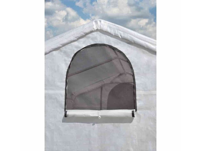 4. Dvě okna zajišťují vyváženou cirkulaci vzduchu ve fóliovníku. Jedno okno se nachází ve vstupní části – „dveřích“ a druhé v zadní části. Boční stěny lze snadno srolovat a zajistit gumovými páskami, aby bylo zajištěno optimální větrání i při vysokých letních teplotách.